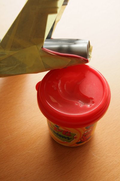 zodat het model ook een vage scheiding tussen de kleuren zou krijgen. Ik lostte m'n probleem op door worstjes te rollen van Play-Doh en deze met wat plakband op z'n plaats te houden. Na gebruik stop je de Play-Doh terug in hun potje om ze voor een volgend model te herbruiken.