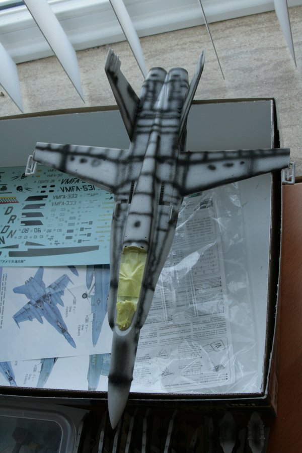 Omdat een Hornet heel vage overvloeien heeft tussen de verschillende grijstonen waarin hij is gespoten moest ik m'n maskers op een afstand van het model kunnen houden